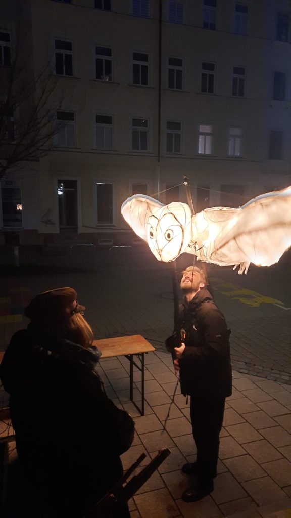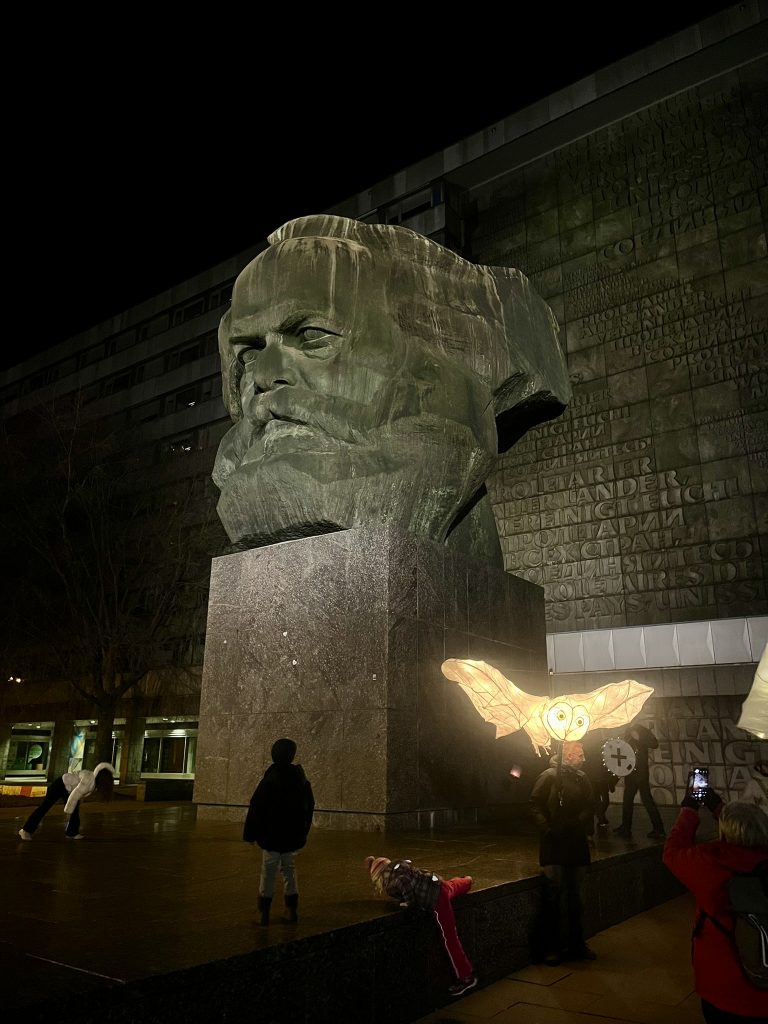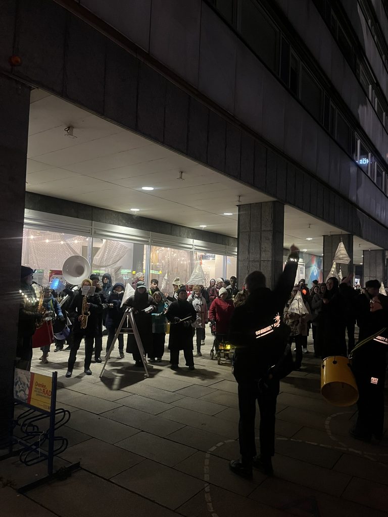 In Workshops im Herbst gestalteten wir mit unseren Kooperationspartner:innen riesige Laternen. Am 12.12.2025 kamen 200 Menschen zusammen, um in einem farbenfrohen Umzug durch Chemnitz zu ziehen und die Stadt zu erleuchten. Musik und kunstvoll gestaltete Laternen wiesen den Weg, angeführt von einer riesigen Laterne – alles von den Menschen in Chemnitz in den Wochen zuvor gemeinsam geschaffen, gebaut und aufgeführt. Jede Laterne trug so eine individuelle Geschichte – von einer Person, einem Ort, einer Reise.